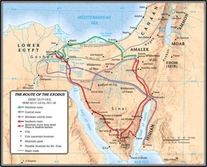 After the Ten Plagues, Moses led the Exodus of the Israelites out of Egypt and across the Red Sea, after which they based themselves at Mount Sinai, where Moses received the Ten Commandments. After 40 years of wandering in the desert, Moses died on Mount Nebo at the age of 120, within sight of the Promised Land.