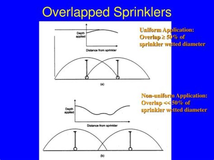 Sprinklers are intentionally designed to require 100% overlap of watered areas. That means each sprinkler throws water ALL the way to the next sprinkler in each direction. READ THAT AGAIN! That’s right, 100% overlap of watered areas is REQUIRED or you will get dry spots!