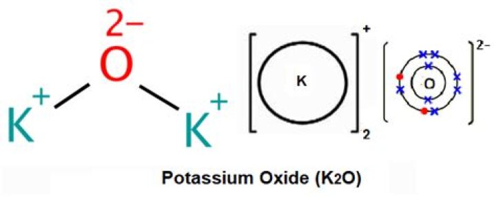 Potassium oxide is an ionic compound formed by combining potassium and oxygen. It carries the chemical formula K2O. Potassium cannot be found free because it is too reactive. It has valency +1 and combines readily with oxygen atoms forming K2O.