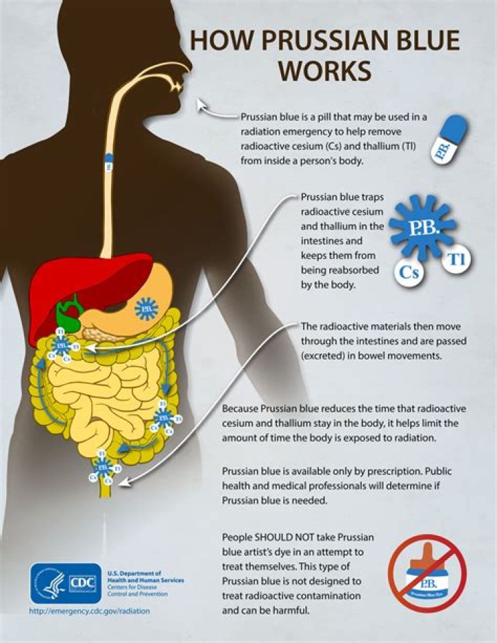 Prussian blue is used to treat radioactive cesium or thallium, or non-radioactive thallium poisoning. It works by combining with thallium and cesium in the intestines. The combination is then removed from the body through the stools.