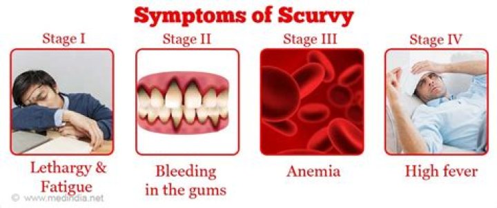 Scurvy is the name for a vitamin C deficiency. It can lead to anemia, debility, exhaustion, spontaneous bleeding, pain in the limbs, and especially the legs, swelling in some parts of the body, and sometimes ulceration of the gums and loss of teeth.