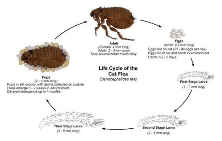 The cat flea life cycle is one of complete metamorphosis, involving the stages of an egg, larva, pupa, and adult. This cycle usually lasts 30 to 75 days, yet may vary due to external factors, such as temperature and humidity.