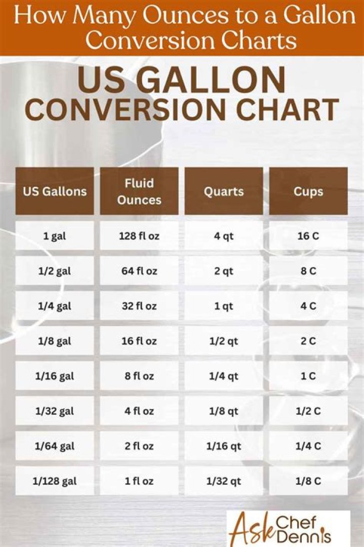 1 gallon = 128 ounces1/4 cup = 2 ounces1 cup = 8 ounces2 pints = 1 quart1/2 cup = 4 ounces4 quarts = 1 gallon