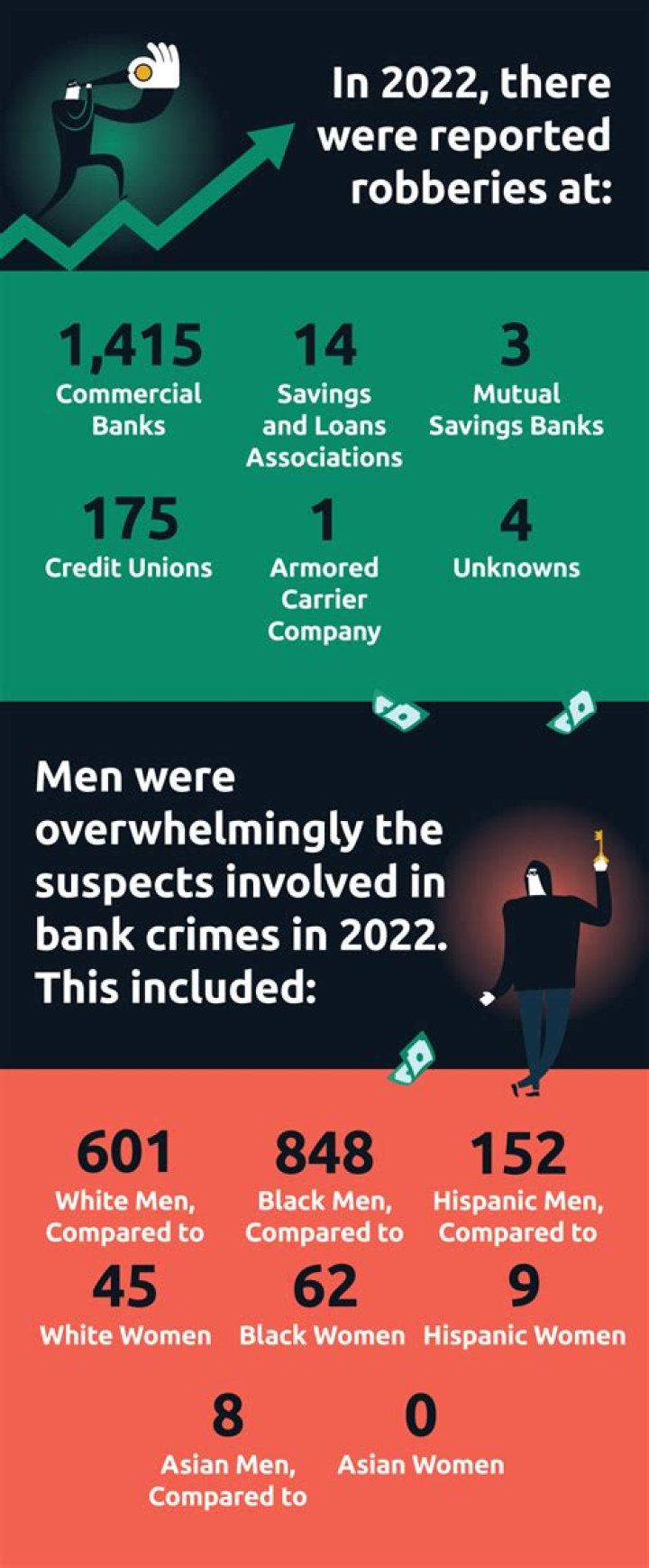 How many bank robberies occur each year? Each year there are approximately 3,000–4,000 bank robberies. According to the Federal Bureau of Investigation, in 2019, out of 267,988 robberies, 1.4% were linked to banks. In addition, banks lost an estimated $482 million due to robberies.