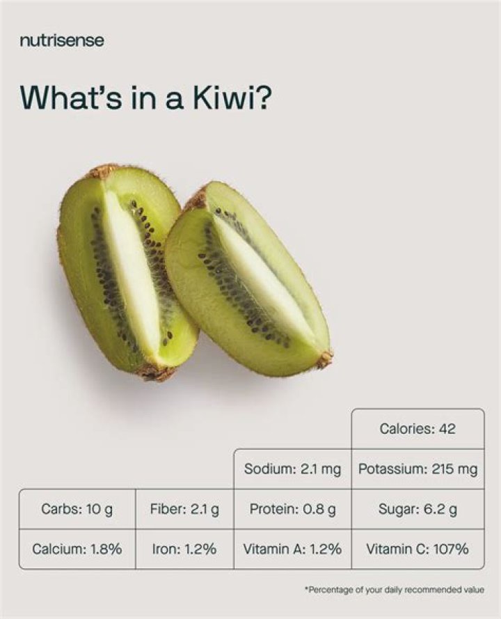 According to the USDA, one delicious, powerhouse kiwi has 215 mg of potassium (5 percent of the DV), 64 mg of vitamin C (71 percent of the DV) and 2 g of fiber (8 percent of the DV). One kiwi also has about 42 calories and 10 g of carbohydrates, so it’s a smart addition to your diabetes-friendly diet.