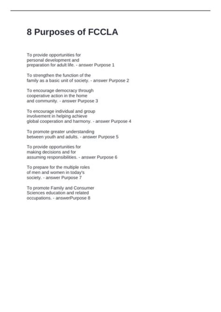 There are 8 purposes of FCCLA: 1. To provide opportunities for personal development and preparation for adult life. 2.