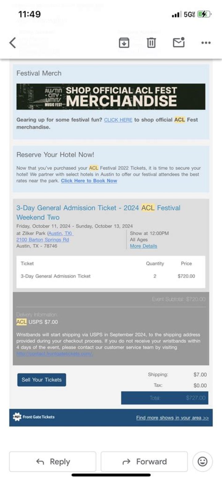 Can you return ACL tickets?To be eligible for a return, your item must be unused and in the same condition that you received it. We require a receipt or proof of purchase. Contact us at [email protected] to return your product and include your order number in the subject of your email.
