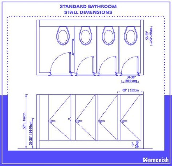 A standard toilet stall will be 36” wide by 60” deep with a 24” wide door. In compliance with the Americans with Disabilities Act (ADA), bathrooms usually require one larger stall designed to accommodate wheelchairs. These ADA stalls are 60” wide by 60” deep with a 36” wide door and found at the end of the row.How tall is a bathroom stall wall?