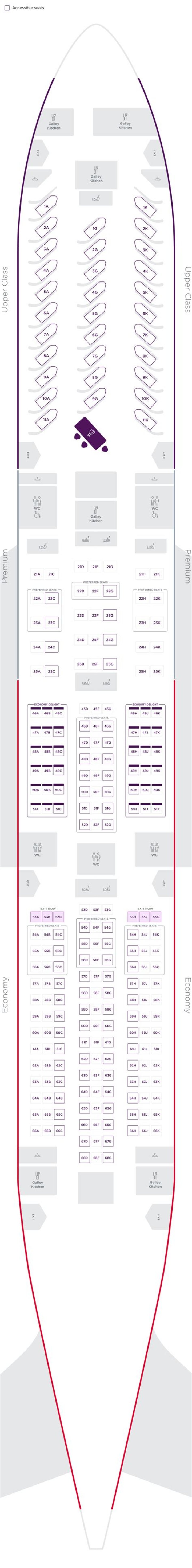 ClassConfigurationSeat pitch *Business PremierRows 1 to 6 (18 seats)Fully lie-flat bedPremium EconomyRows 23 to 25 (21 seats)41” (104cm)EconomyRows 34 to 65 (263 seats)31 – 33” (78 – 83cm)Economy Skycouch™Rows 36 to 43 ABC and 36 to 41 HJK32 – 33” (81 – 83cm)
