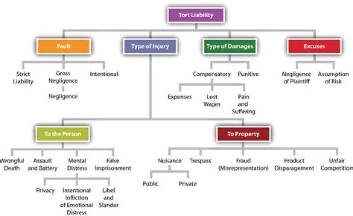 Torts fall into three general categories: intentional torts (e.g., intentionally hitting a person); negligent torts (e.g., causing an accident by failing to obey traffic rules); and strict liability torts (e.g., liability for making and selling defective products – see Products Liability).