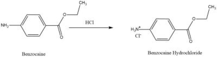 The Benzocaine reacts with hydrochloric acid to form benzocaine hydrochloride.