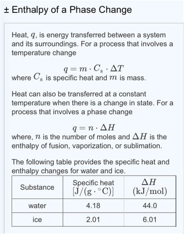 The formula q = mc∆T can be used to calculate the enthalpy change per mole of a substance which dissolves in water to form a solution. When an acid reacts with an alkali, a neutralisation reaction occurs. The enthalpy change of the neutralisation reaction can be calculated per mole of water formed in the reaction.
