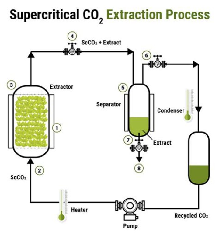 Supercritical carbon dioxide extraction is a commonly used method to separate various components from the plant due to it producing a pure, clean, and safe product. Carbon dioxide reaches a supercritical state at 1071 psi and 31.1°C. When a molecule is in a supercritical state, it has properties of both liquid and gas.