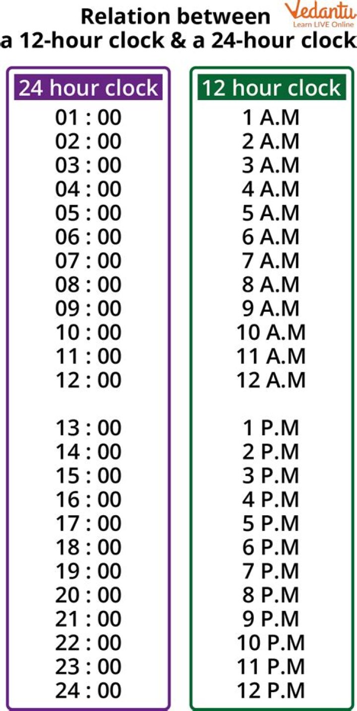 The 12-hour clock runs from 1am to 12 noon and then from 1pm to 12 midnight. The 24-hour clock uses the numbers 00:00 to 23:59 (midnight is 00:00).