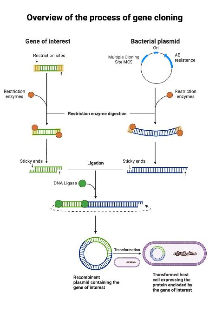 Gene cloning is the process in which a gene of interest is located and copied (cloned) out of all the DNA extracted from an organism. The basic steps in gene cloning are: DNA. (deoxyribonucleic acid) The molecule that encodes genetic information.