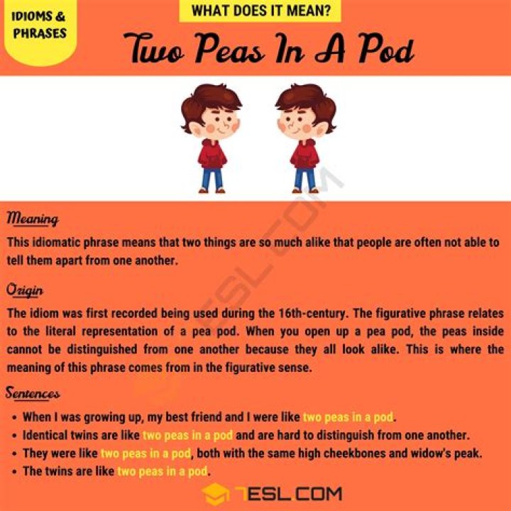 When to Use “Two peas in a pod” It’s usually used as a way to compliment friends, a couple, kids, twins, or perhaps even coworkers, but it’s also possible to use it more negatively or passive-aggressively. … Two people might look like or act like “two peas in a pod,” meaning they act identically.