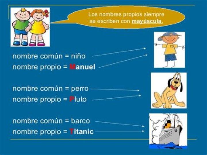 Son los nombres de las personas, ciudades, ríos y se escriben con la primer letra mayúscula. NOMBRES COMUNES: Son los nombres de animales y objetos, se pueden escribir con letra minúscula.
