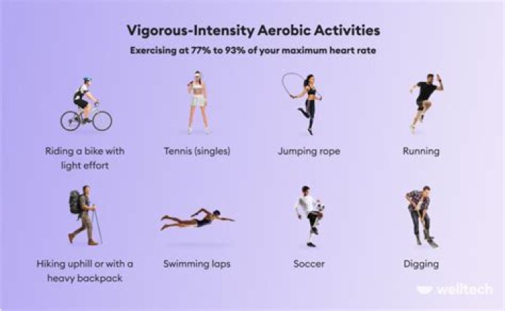 hiking uphill or with a heavy backpack.running.swimming laps.aerobic dancing.heavy yardwork like continuous digging or hoeing.tennis (singles)cycling 10 miles per hour or faster.jumping rope.