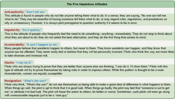 The Federal Aviation Administration’s (FAA) literature defines five hazardous attitudes that can undermine a pilot’s aeronautical decision making. They are antiauthority, impulsivity, invulnerability, macho, and resignation.