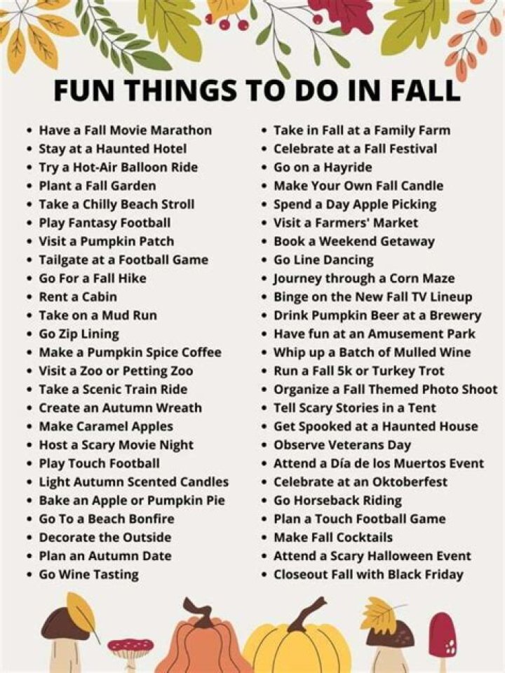 of 55. Attend a Fall Festival. … of 55. Light a Fall Candle. … of 55. Have a Fall Photoshoot. … of 55. Make Caramel Apples. … of 55. Go Horseback Riding. … of 55. Tailgate at a Football Game. … of 55. Go to a Petting Zoo. … of 55. Get Spooked at a Haunted House.