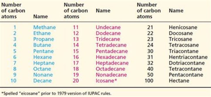 For example the first 10 alkanes in order are , Methane, Ethane, Propane, Butane, Pentane, Hexane, Heptane, Octane, Nonane and Decane. These can be memorised with “Many elephants prefer blue pinapples.