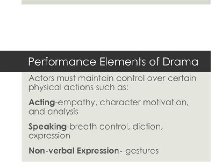 performance elements include acting (e.g., character motivation and analysis, empathy), speaking (breath control, vocal expression and inflection, projection, speaking style, diction), and nonverbal expression (gestures, body alignment, facial expression, character blocking, movement).