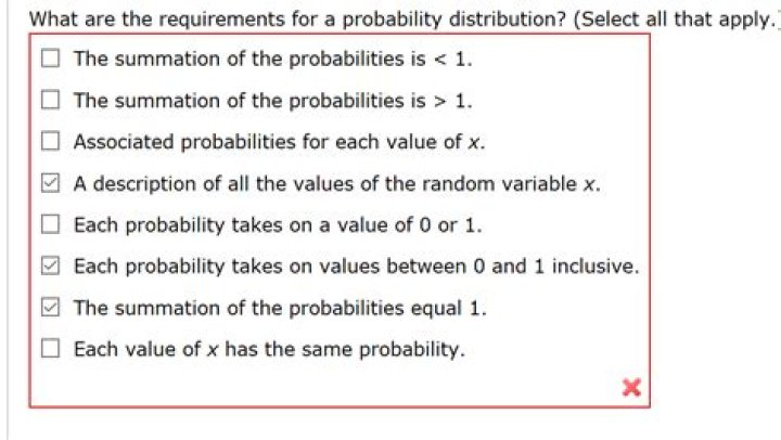 What are the two requirements for a discrete probability distribution Choose the correct answer below Select all that apply quizlet?What are the two requirements for a discrete probability distribution? Each probability must be between 0 and 1, inclusive, and the sum of the probabilities must equal 1. Each probability must be between 0 and 1, inclusive, and the sum of the probabilities must equal 1.