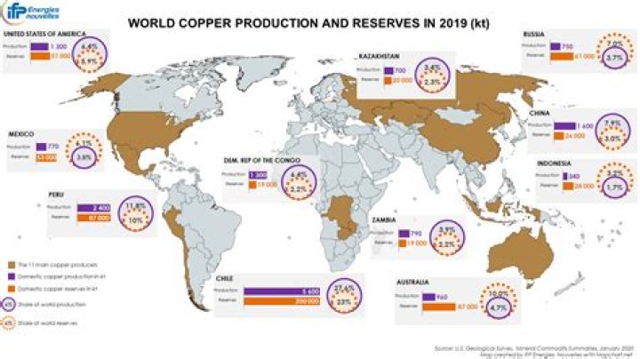 Major countries in world copper production Chile, the world’s leading copper producer by far, produced an estimated 5.7 million metric tons of copper in 2020. In second place is Peru, with an estimated copper mine production of 2.2 million metric tons in the same year.