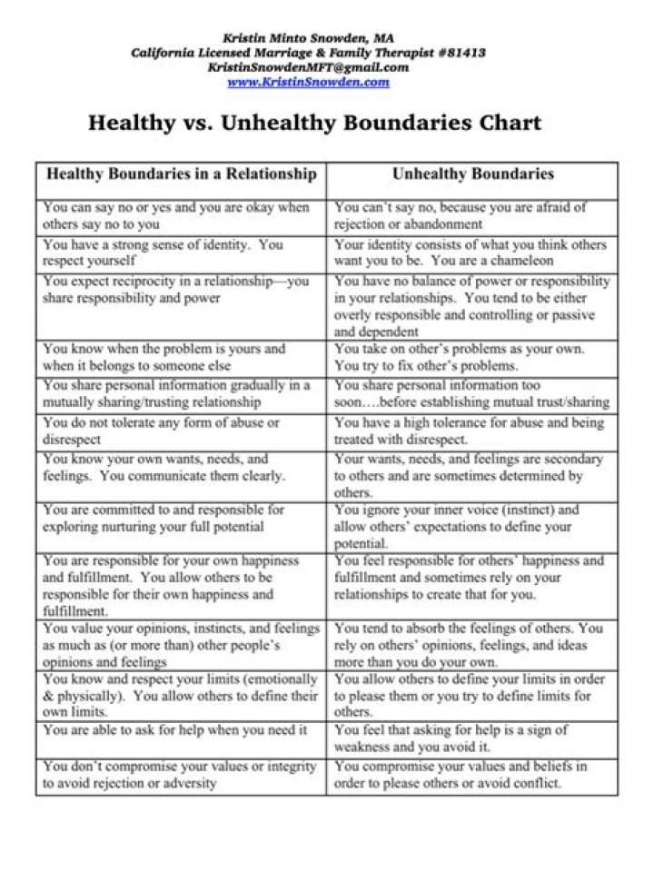 Examples of weak boundaries might include feeling incomplete without another person, feeling unable to express one’s own wishes and preferences, engaging in acts of physical intimacy even when they are uncomfortable or don’t feel right, accepting physical touch such as pats or hugs when unwanted, lacking needed or …
