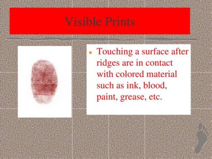 Visible prints are formed when blood, dirt, ink, paint, etc., is transferred from a finger or thumb to a surface. Patent prints can be found on a wide variety of surfaces: smooth or rough, porous (such as paper, cloth or wood) or nonporous (such as metal, glass or plastic).