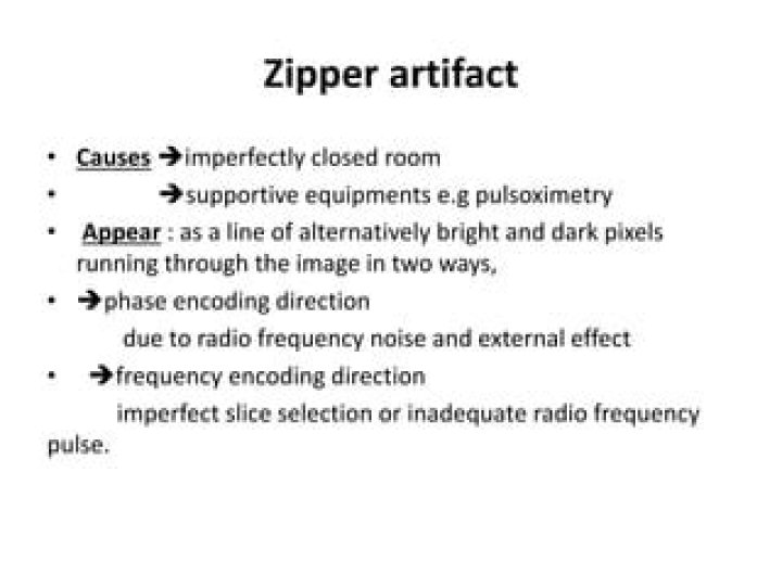 Zipper artifacts are a type of MRI artefact where one or more spurious bands of electronic noise extends across the image. There are various causes for zipper artifacts in images and no single solution exists. These artefacts can be related to hardware or software problems either of the scanner itself or the shielding.