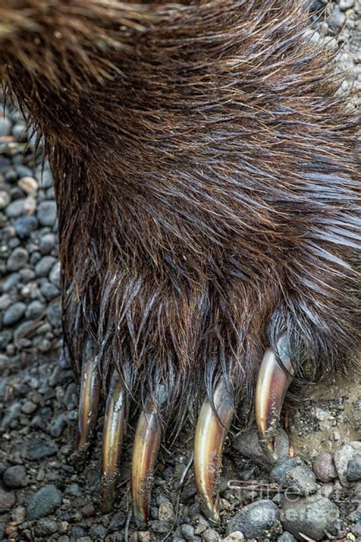Grizzly bear claws vary in colour from white to dark with light streaks. When looking at grizzly bear tracks, claws marks are evident 5 cm or more in front of the toes. Black bears have short, black claws (3-4 cm), great for climbing trees.