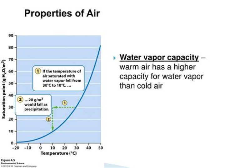 The maximum amount of water vapor that can be in the air depends on the air temperature. Warmer air can hold more water vapor within it.