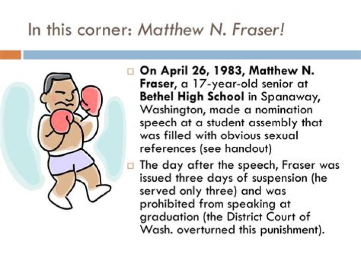 Fraser suspended for lewd speech Fraser for delivering a speech laced with sexual references before a student assembly. Fraser’s speech, nominating a classmate to a student elective office, referred to the student as “firm in his pants,” who would take it to “the climax.”
