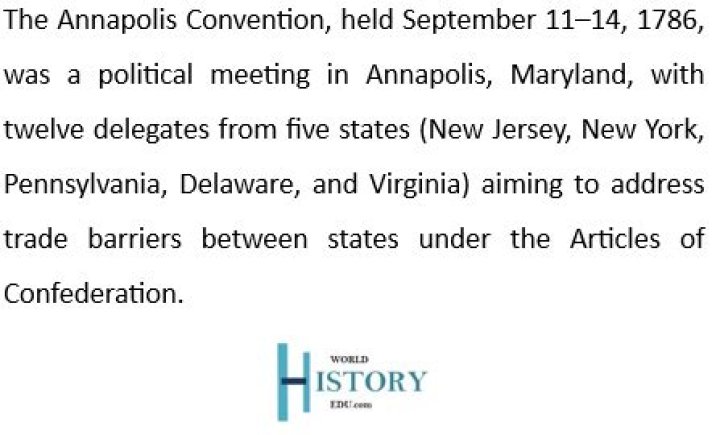 A meeting called by the state of Virginia held in Annapolis, Maryland, in September 1786 to which all 13 states were asked to send delegates. The purpose of the meeting was to discuss the commercial problems besetting the United States under the Articles of Confederation.