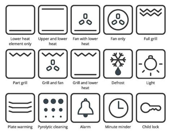 SymbolDescriptionQuick PreheatA box with three wiggly lines inside, plus two small triangles in the bottom cornerConvectionA box featuring a fan symbol with three-quarters of a circle over itConventionalA box featuring two horizontal lines, one at the top and one at the bottom