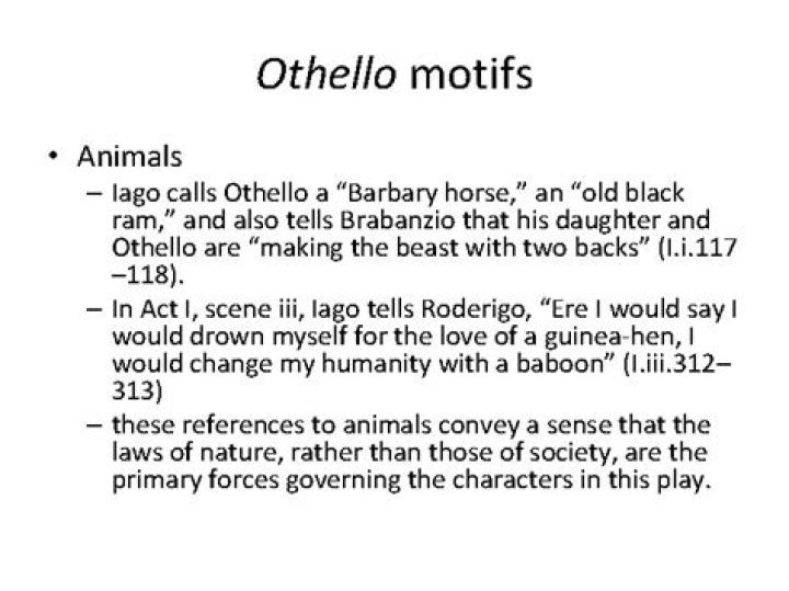 Iago uses a lot of animal imagery to describe Othello. In Act 1 Scene 1, he calls him a ‘Barbary horse’ and an ‘old black ram’, using these images to make Desdemona’s father angry and telling him that Othello and Desdemona ‘are making the beast with two backs’. This continues in Iago’s soliloquies.