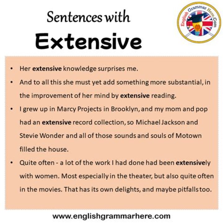 of great extent; wide, broad: an extensive area. covering or extending over a great area: extensive travels. far-reaching; comprehensive; thorough: extensive knowledge. lengthy: an extensive journey. great in amount, number, or degree: an extensive fortune; extensive political influence.