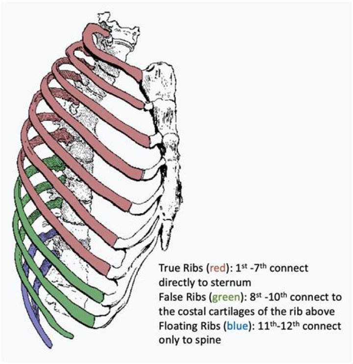 The 8th, 9th, and 10th pairs—false ribs—do not join the sternum directly but are connected to the 7th rib by cartilage. The 11th and 12th pairs—floating ribs—are half the size of the others and do not reach to the front of the body. Each true rib has a small head…