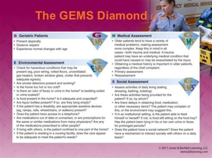 The GEMS Diamond is a simple way to remember the following four points when assessing an older patient: … Remember geriatric patients deserve respect (as with all patients), and anticipate the presence of normal changes that occur with the natural aging process. ◾E – Environmental Assessment.