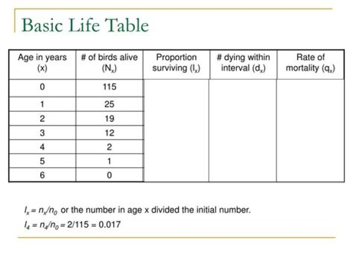 lx = Proportion alive at the beginning of age interval x. dx = Number dying during age interval x. qx = Mortality rate during age interval x (i.e., qx = dx / nx) ex = Expectation for further life of an individual of age x.