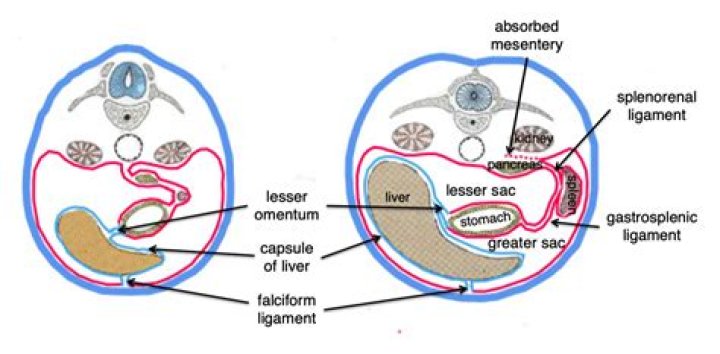 The liver develops in the ventral mesogastrium, the spleen develops in the dorsal mesogastrium. The liver grows rapidly, pressing against the body wall, and obliterating these layers of peritoneum. These changes produce this almost separate pocket behind the stomach, the lesser sac.