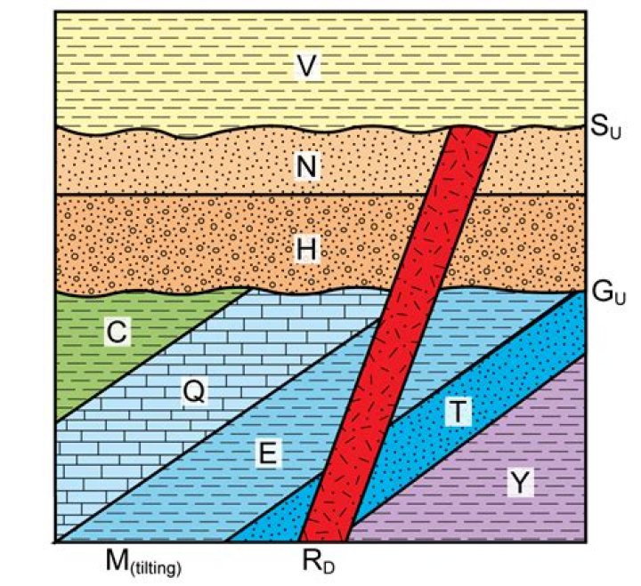 The Law of Original Horizontality suggests that all rock layers are originally laid down (deposited) horizontally and can later be deformed. This allows us to infer that something must have happened to the rocks to make them tilted. This includes mountain building events, earthquakes, and faulting.