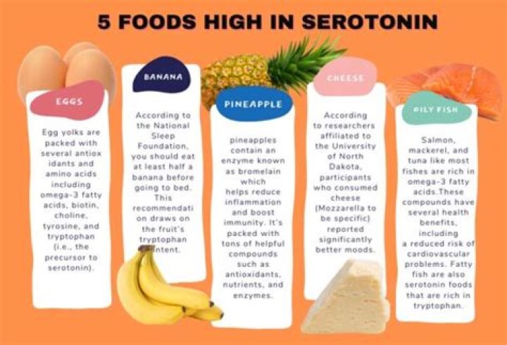 Salmon. Salmon is a rich source of tryptophan, which is important for producing serotonin. … Nuts and Seeds. … Turkey and Poultry. … Eggs. … Tofu and Soy. … Milk and Cheese. … Pineapple.