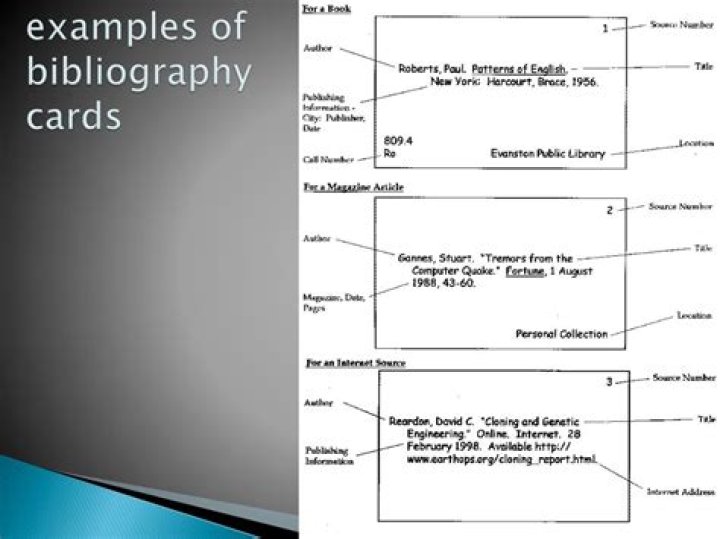 → A bibliography card contains the following information: publication information, numbered source, type of source, and location of the source.