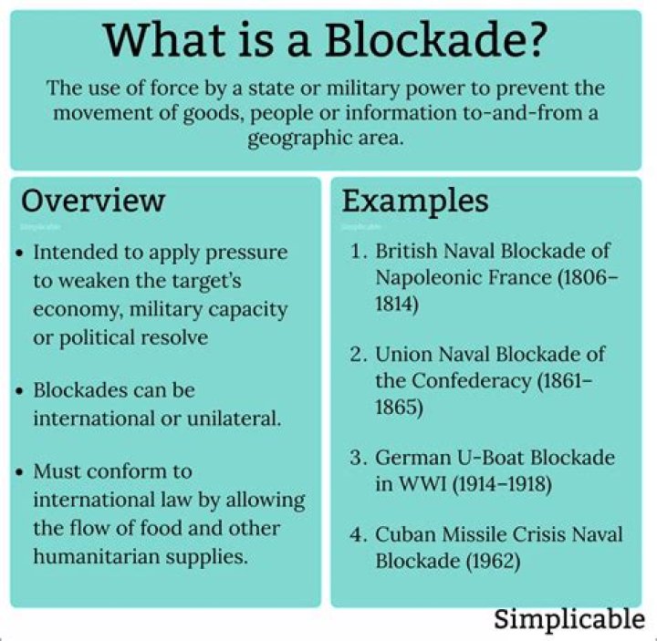 A blockade is the act of actively preventing a country or region from receiving or sending out food, supplies, weapons, or communications, and sometimes people, by military force. … While most blockades historically took place at sea, blockades are also used on land to prevent entrance of an area.