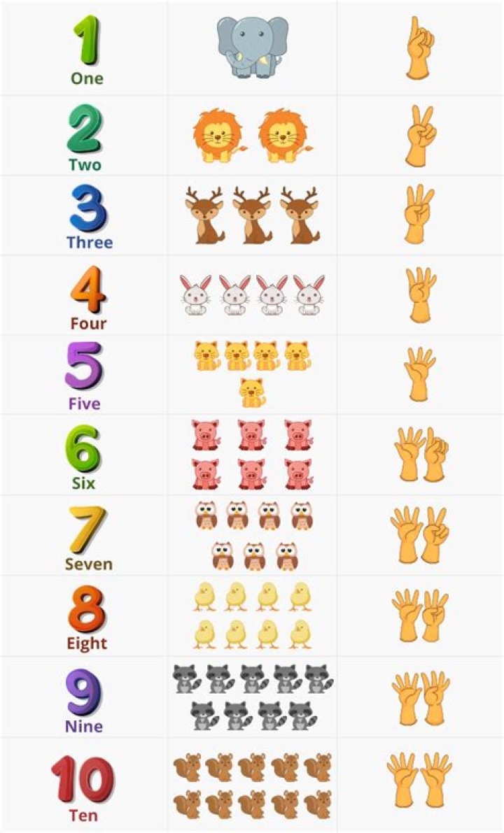 Counting numbers are used to count objects. Here, for instance, we have used counting numbers to determine the number of animals or birds. The table also show how we can use our fingers to count objects to ten.