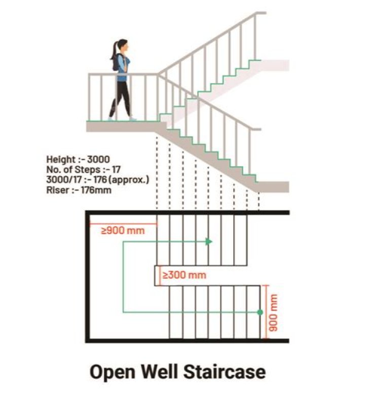 Open well staircase :a stair built around a well opened space simply near an area which is not conjusted. Dog legged staircase : it consists of two straight flights of steps with direct turns between them. This staircase is very useful where the total width of the stair is just twice the width of the step.