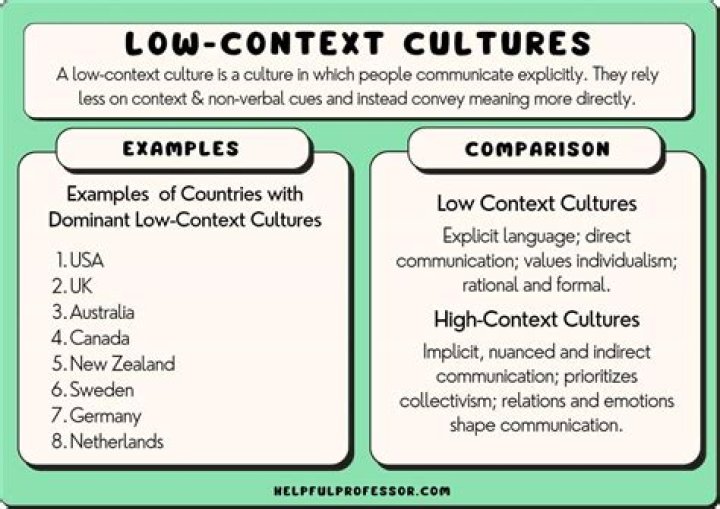 High-context cultures are those that communicate in ways that are implicit and rely heavily on context. In contrast, low-context cultures rely on explicit verbal communication. High-context cultures are collectivist, value interpersonal relationships, and have members that form stable, close relationships.