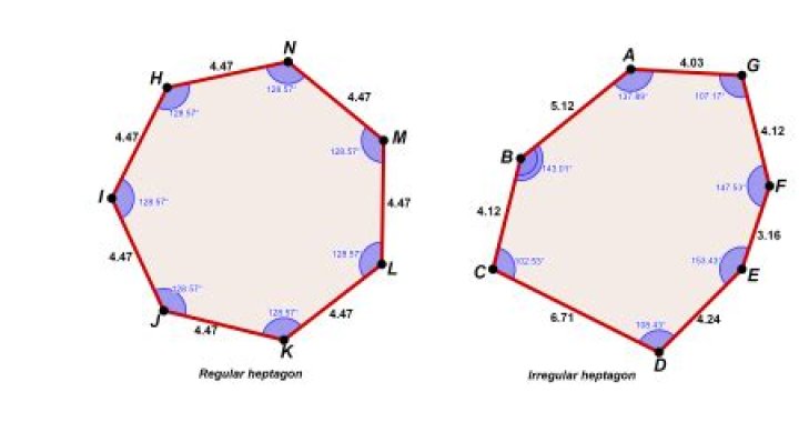 Regular hexagonIrregular hexagonAll sides and interior angles are equalNot all sides and angles are equalWhat is regular heptagon?